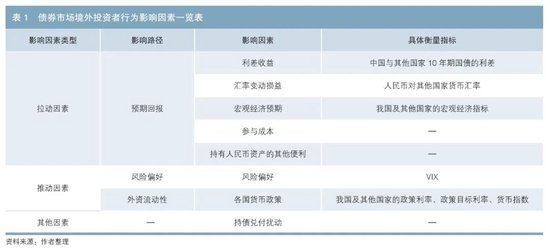 前期相关研究表明,债券市场境外投资者行为的主要影响因素包括本国的拉动因素和国外的推动因素两大类。