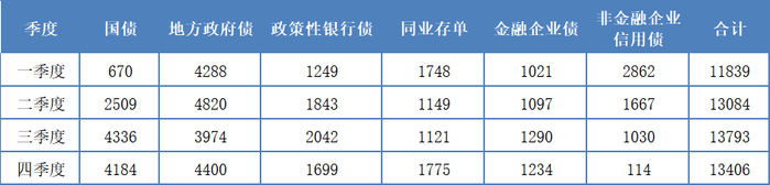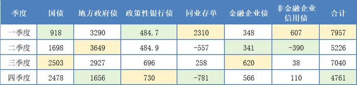 2. 地方政府债券在5月、8月、10月和1月净供给量较大,在5400亿~7700亿元之间,在各季度分布相对均匀,因此地方政府债券的季度净融资量波动不大。4月和7月的地方政府债券供给量最小,分别为2128亿元、1470亿元。