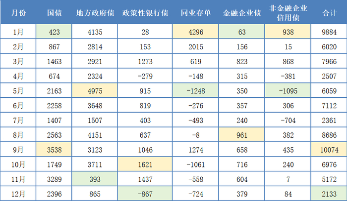 1. 银行对国债的净增持规模按从大到小排序为:9月>11月>8月>12月>6月>5月>10月>3月>7月>2月>4月>1月。排序基本与国债净发行规模的次序保持一致,只除了后者3月和7月的次序有所对调。从全年月度的极值看,9月国债的发行和净供给量为全年最大,也是银行全年增持国债以及所有债券规模最大的月份。1月、4月银行国债买得少,主要因国债的净发行量全年相对最少,为此银行不得不从二级市场净买入国债。