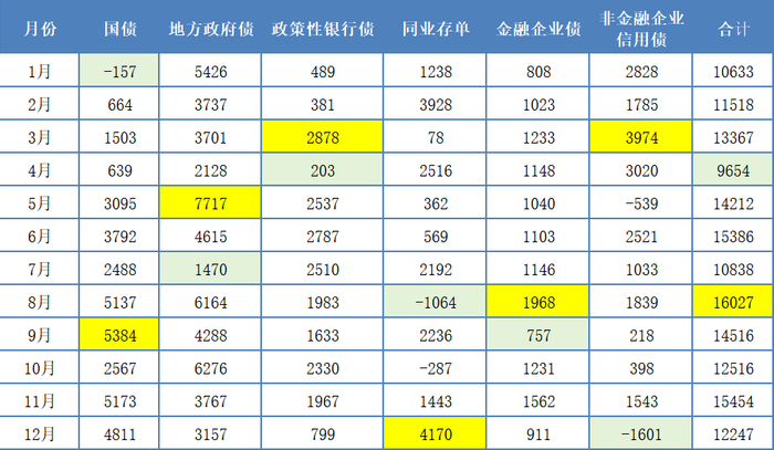 4. 非金融企业信用债净供给规模靠前的月份主要在3—4月,分别为3974亿元、3020亿元,其次是1月和6月。因此,一季度信用债供给最旺,主要集中在1月和3月,2月供给相对少,或由于春节假期导致工作日减少。信用债供给最少的月份为12月和5月,是全年中出现负增长的两个月,尤其是12月,净供给规模为-1601亿元,大大拉低了四季度的净供给规模。