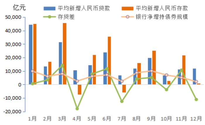 2. 4月、7月和12月均是银行债券需求较弱的月份。其中,12月表现最弱,银行仅净增持2133亿元债券,仅是9月的21%。12月银行面临跨年资金需求旺盛、贷款规模增加、新增存款大幅减少等因素影响,银行资金面面临一定压力,抑制其增持债券。