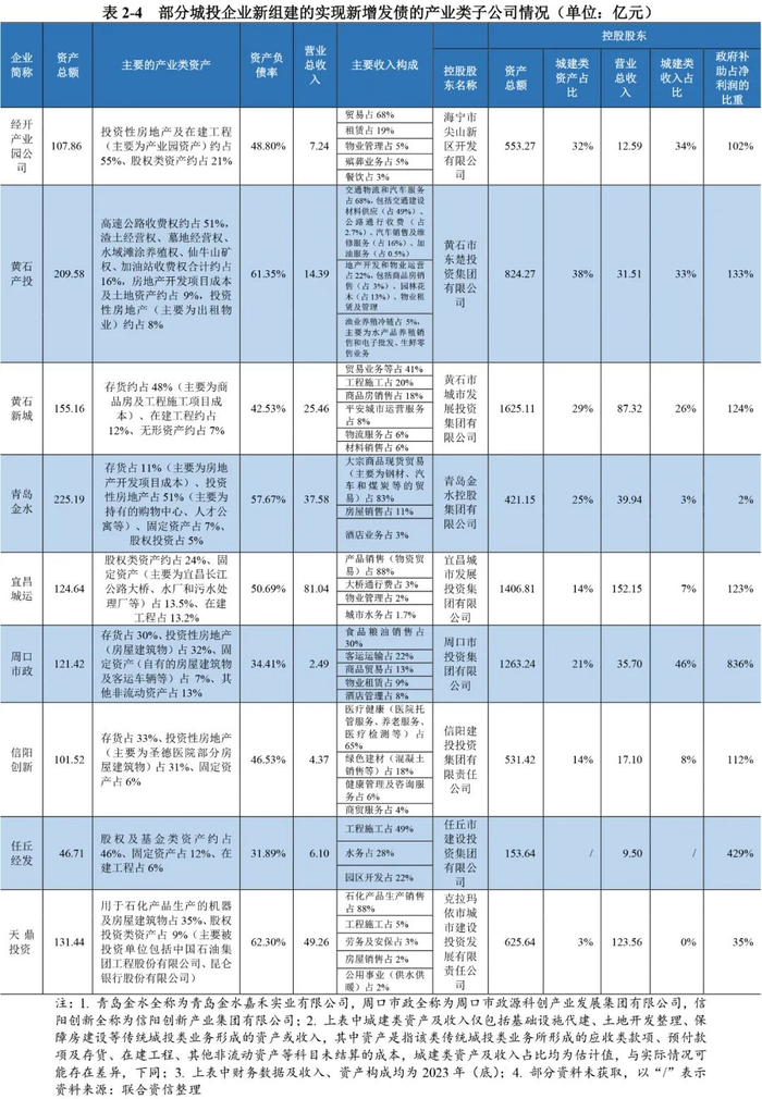 方式二下由城投企业内部打造形成的产业类子公司共14家,其资产规模不大,产业类资产占比较高,业务以产业园投资运营、收费路桥运营、资产租赁、工程施工、房地产开发等为主。下表列示了部分城投企业新组建的产业类子公司的相关情况,一定程度上为城投企业组建产业类子公司提供参考。