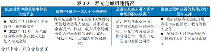方式一下由地方政府统筹资源打造的样本企业共11家。其中,寿光金旭定位为寿光市重要的产业投资运营主体,寿光市政府将其持有的发债企业山东寿光金鑫投资发展控股集团有限公司(以下简称“寿光金鑫”)以及寿光市市属企业持有的潍坊含羞草护理科技股份有限公司(以下简称“含羞草公司”)、寿光市富源盐业有限公司、寿光市教育发展集团有限公司、寿光市光发电力有限公司等多家企业股权无偿划入寿光金旭。寿光金鑫是山东省寿光市重要的国有资本投资运营主体之一,承担了寿光市部分基础设施建设和棚户区改造等职能,并拥有2家生产销售钢管及能源装备的上市公司,可为寿光金旭贡献市场化收入。而含羞草公司(主要负责医疗卫生用品生产销售)等企业则主要提供利润贡献。