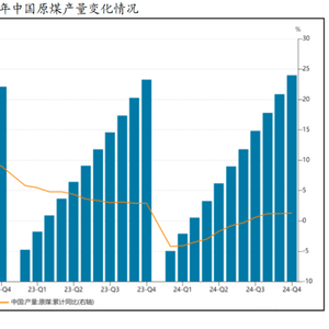 中国原煤供给以国内为主、进口为辅。据国家统计局数据,2024年全国规模以上煤炭企业原煤产量47.59亿吨,同比增长1.30%。随着2021年以来的煤炭增产保供政策带来的新增产能逐步充分释放,全国原煤产量增速较上年明显放缓。进口煤方面,2024年,受价差及汇率影响,澳大利亚及蒙古煤炭进口量增幅较大。根据海关总署公布的数据,2024年,全国累计进口煤炭(煤及褐煤)5.43亿吨,同比增长14.40%。