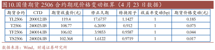 上方粗算结果表示,4月23日,T2506的CTD(240025.IB)收益率变动1bp,期货价格应对应变动约0.075元。