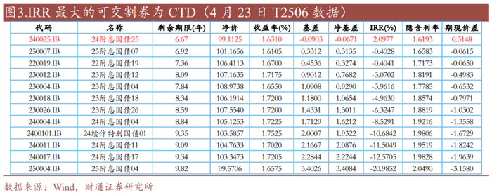 在交割期,期货合约的空头有权利选择一只可交割券给多头(称为空头举手的交割制度),多头支付的价格是按照空头所选择的债券的转换因子所计算的期货调整价格再加上应计利息支付给合约的空头,空头会选择交割成本最低的可交割券进行交割,即CTD(最便宜可交割券)。在某一确定交易日,不同现券与同一合约的净基差与IRR通常有反向关系,净基差更低的现券往往对应更高的IRR,在所有可交割券中IRR最高的现券即CTD,CTD会随着净基差/IRR的变化而改变。