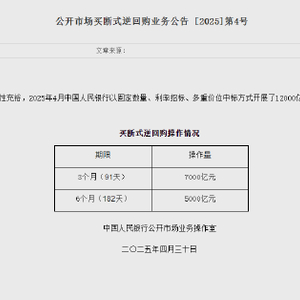 中国人民银行:2025年4月中国人民银行以固定数量、利率招标、多重价位中标方式开展了12000亿元买断式逆回购操作