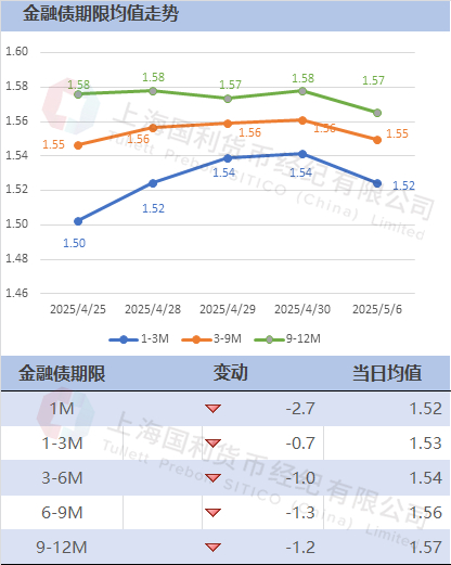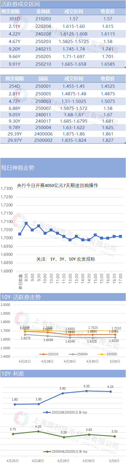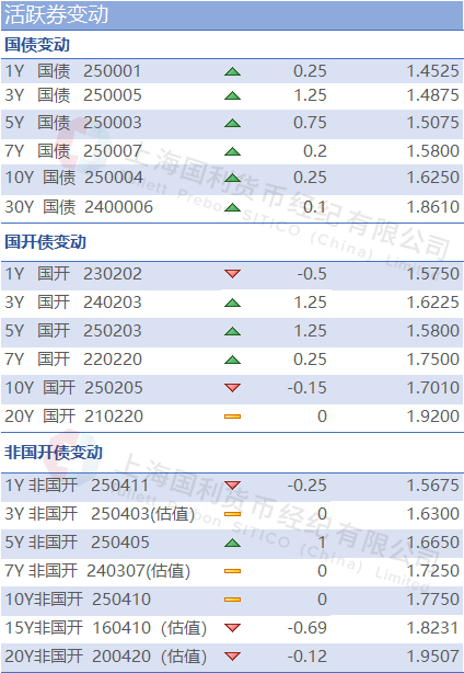 1年国开230202成交在1.58-1.585;1年非国开250411成交在1.57-1.5825;3年国开240203成交在1.6075-1.635;3年非国开250403无成交;5年国开250203成交在1.5675-1.59;5年非国开250405成交在1.655-1.675;7年国开220220成交在1.7475-1.76;7年非国开240307无成交;10年国开250205成交1.695-1.704;10年非国开250410成交在1.775-1.7875。