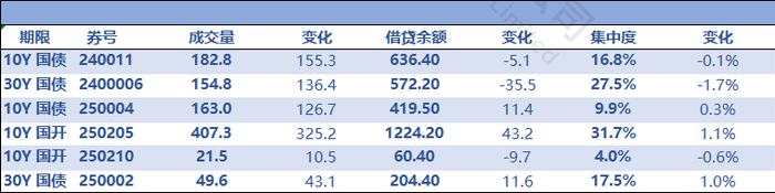 活跃券方面,10年国债250004有少量新增的跨月需求,240011续做为主总体需求一般。10年国开250205需求旺盛,借贷余额增加43亿,250210和240215需求较弱。30年国债2400006有部分到期不续,短期限平仓较多,整体供应转松,借贷余额减少35亿。230023新增需求旺盛,借贷余额增加10亿,供应较为紧张。250002有小量新增需求,借贷余额增加11亿。