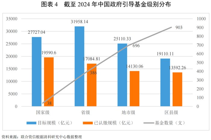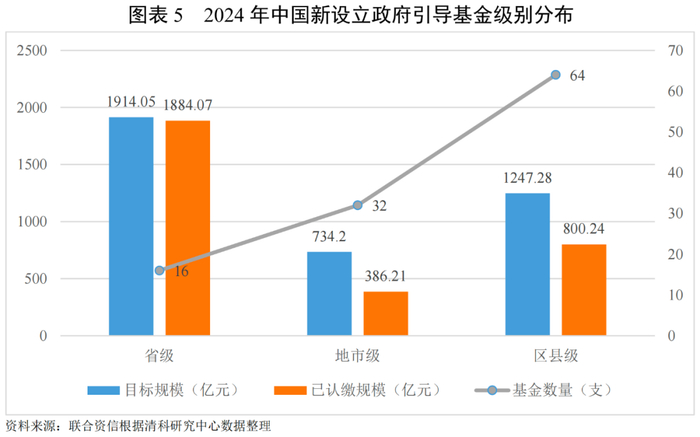 受地方财政压力和监管趋严影响,2024年中国政府引导基金设立节奏放缓,其中江苏、广东、北京累计认缴规模居前,上海和北京新增规模领先;存量政府引导基金的级别分布体现出了层级越低数量越多且单支基金平均规模越小的特征。