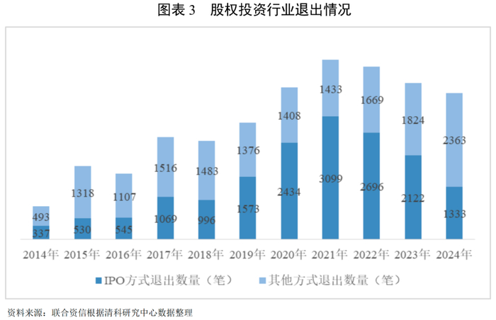 2024年中国股权投资市场退出端延续了下滑趋势,处于延长期的基金规模持续增长。作为主要退出方式的IPO政策环境未见改善,机构寻求多元化退出路径,但短期内面临的退出压力难以明显缓解。
