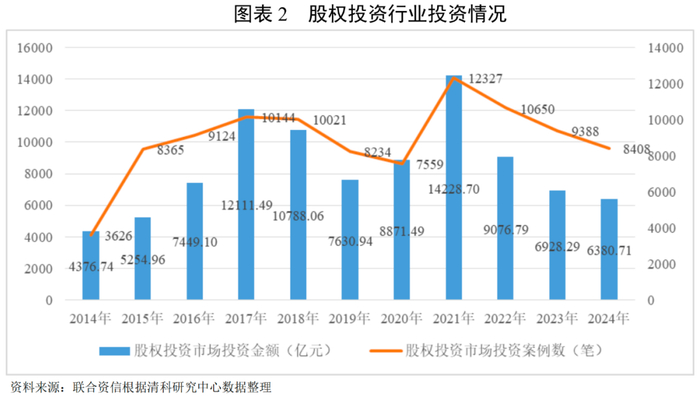 在经历2021年投资市场的补足式增长后,2022年以来中国股权投资市场的活跃度受多重因素影响而出现回落。根据清科研究中心数据,2024年中国股权投资市场的投资案例数共8408起,剔除极值案例后披露金额6036.47亿元,同比降幅分别为10.4%和10.3%,降幅较2023年(11.8%和12.2%)有所收窄。