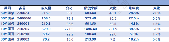 活跃券方面,10年国债250004需求温和上升,长期限供给偏紧,月内供需均衡,借贷余额增加63亿。10年国开方面250205需求全面爆发,尾盘结算出现物理拥挤,借贷余额大增282亿,7D以上期限供给均较为紧张。250210供应宽松,需求较少。30年国债230023需求持续旺盛,借贷余额继续增加48亿,30年各只活跃券供给均呈现偏紧状态。明日25t2续发上市,有望释放一波供给。