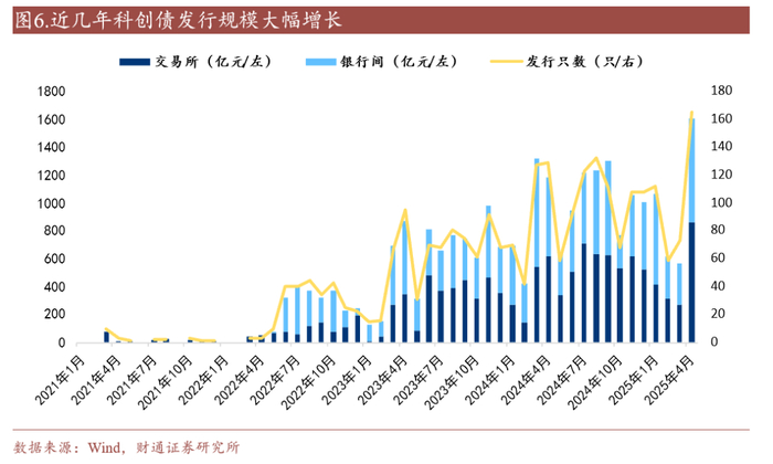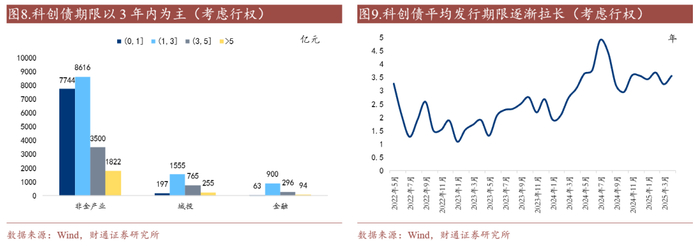 截至2025年5月9日,科创债主体主要分布在非金融产业,城投也有少量发行,2021年起至今规模合计2773亿元,金融类发行规模最少,仅1353亿元。科技板推出后,金融机构与股权投资机构发行科创债得到支持,预计未来金融类发行规模将会大幅增加。