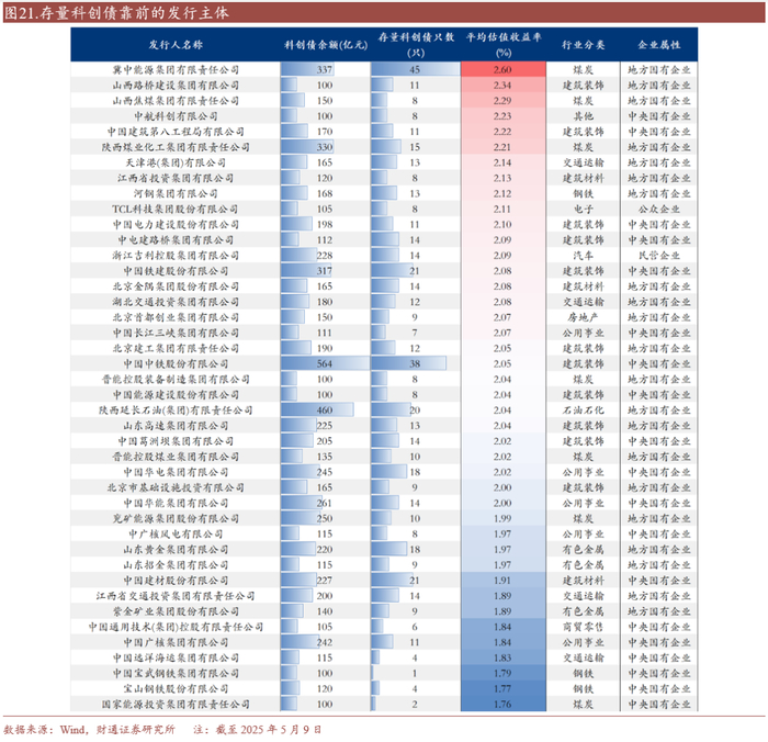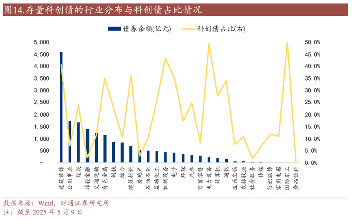 截至2025年5月9日,全市场共有1852只科创债,存量规模合计18629亿元。当前存量科创债集中在建筑装饰(4598亿元)、公用事业(1743亿元)、煤炭(1696亿元)、非银金融(1407亿元)、交通运输(1251亿元)等行业,其中国防军工、电力设备、机械设备、建筑装饰、建筑材料、电子、有色金属、通信行业的科创债余额占全部信用债比重较高,超过30%。