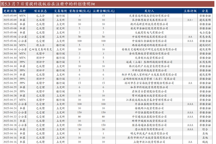 科创债申报方面,自3月7日首提科技板后,截至5月9日,交易所和银行间共有53个科创债项目在注册通道中,合计申报规模1126亿元,其中公开发行项目17个。分行业看,非银金融类发行人最多,有27家,以证券公司和股权投资机构为主,申报规模合计789亿元;其次是城投,有9家。分主体评级看,较多股权投资机构暂无主体评级。