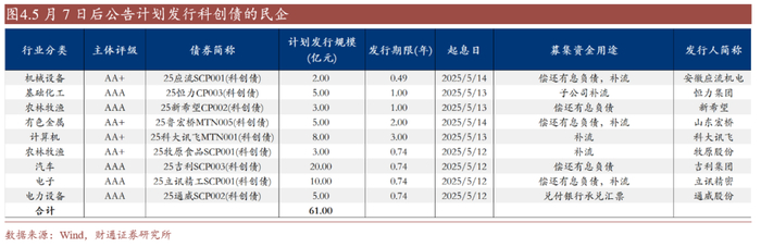 另外多家民企公告科创债发行计划,行业涉及机械设备、基础化工、计算机、电子、电力设备等,发行期限偏短,用途主要为偿还有息负债和补流。