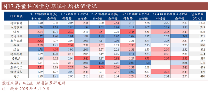 分期限看估值水平,科创债较全部信用债平均估值偏低,但部分行业也存在一定估值溢价。0-1Y,煤炭、有色和钢铁行业的科创债较该行业全部信用债的平均估值存在一定溢价;此外,1-2Y的煤炭和石油石化、2-3Y的煤炭、3-5Y的钢铁、5Y及以上交运行业的估值溢价情况也值得关注。