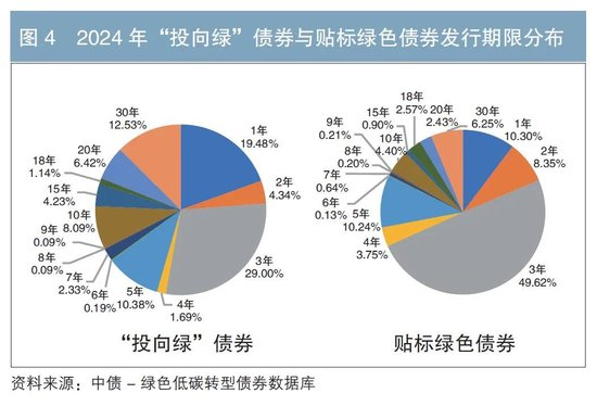 在“投向绿”债券的发行期限中,3年期债券占比最高(29%),其次是1年期和30年期债券,占比分别为19%和13%。整体期限结构相对较长(见图4)。