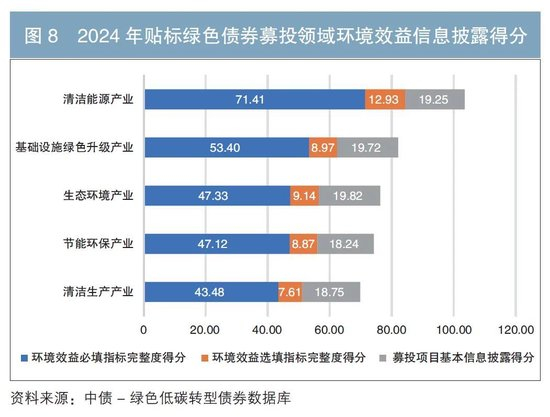 2024年,公开发行的贴标绿色债券的募投项目主要集中于清洁能源产业、基础设施绿色升级产业、节能环保产业等领域。其中,环境效益信息披露完整度得分最高的行业依次为清洁能源产业、基础设施绿色升级产业和生态环境产业(见图8)。