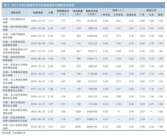 中央结算公司针对绿色债券市场运行情况推出中债绿色及可持续发展系列指数族系,助力绿色金融发展。2024年,中债-绿色债券综合指数稳步增长,由2024年初的132增长至138,绿色债券整体表现稳中向好(见图6、表4)。截至2024年末,指数总市值为1.6万亿元,过去3年指数年化回报率为3.62%,年化波动率为0.97%,整体呈现收益稳健、波动可控的特点。