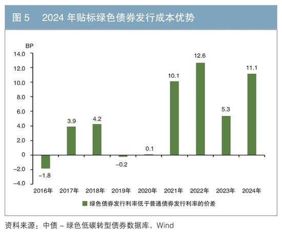 2024年,我国贴标绿色债券发行成本优势为11.1个基点(BP),较2023年增加5.8BP。2024年发行的贴标绿色债券在发行当年为发行人累计节约财务成本约7.6亿元,在全生命周期为发行人累计节约成本约41.2亿元,节约规模均高于2023年。