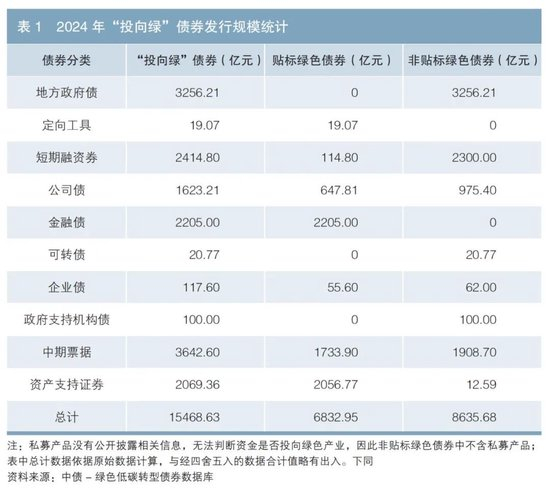 2024年,我国发行“投向绿”债券1270只,发行规模为15469亿元。其中,贴标绿色债券发行规模为6833亿元,非贴标绿色债券发行规模为8636亿元(见表1)。
