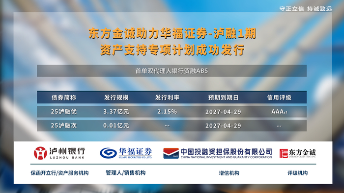 近日,由东方金诚评级的“华福证券-泸融1期资产支持专项计划”(以下简称“本期专项计划”)在深交所债券市场成功发行。本期专项计划发行规模3.38亿元,为首单双代理人银行贸融ABS。其中,优先级发行规模3.37亿元,发行利率2.15%。