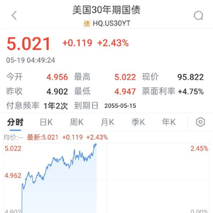 美国30年期国债收益率升至5.02%,创下2023年11月以来的最高水平。
