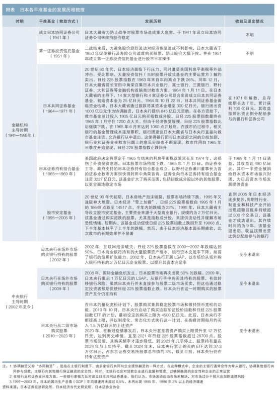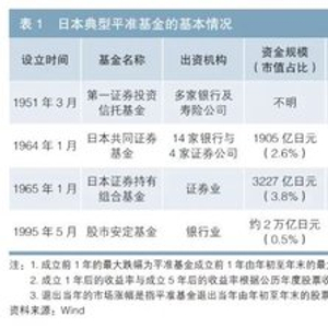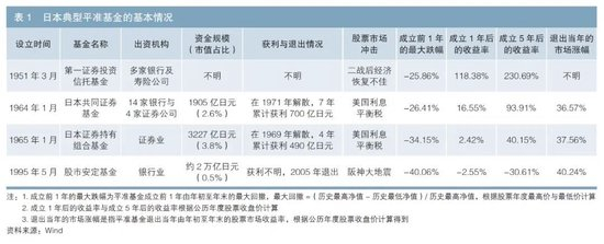 日本典型平准基金包括1951年在第二次世界大战(以下简称“二战”)后的经济恢复期成立的第一证券投资信托基金、为应对1963年美国利息平衡税冲击1成立的日本共同证券基金和日本证券持有组合基金,以及为应对阪神大地震于1995年5月成立的股市安定基金(见表1)。