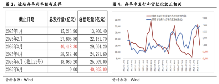 那么6月份存单会不会净发行很多?我们首先要理清楚,银行发行存单是为什么?目前主要是应对贷款的需求,毕竟存单和债券利率已经倒挂了,发存单去买债券肯定不合适了。从过去历史看,存单的净发行和贷款投放呈现正相关。贷款投放多的时候,存单需要净发行多;贷款少,存单净发行压力不大。