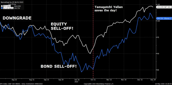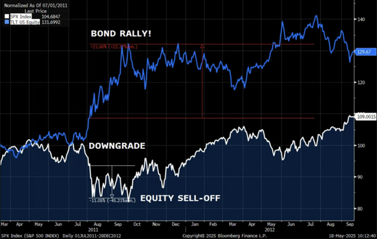 2011年8月,美国国会投票提高债务上限仅四天后,标准普尔成为第一家取消美国AAA评级的机构。市场当即反应非常强烈:标普指数次日下跌6.5%;与常识预期相反的是,美债(见下图蓝线)却上演了一场大规模的绝地反弹,30年期美债在随后的两个月上涨了约 20%!这种反直觉的市场反应反映了当时的独特背景:欧元区危机促使资金转向美国资产,尽管评级下调,但美国国债仍被视为最终的避风港。
