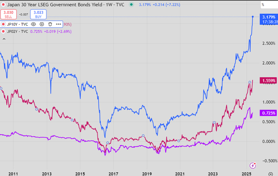 本周,日本的20年发债不理想,造成了日本长端利率暴涨,就是最好的例子。2020这三年历史性在于,席卷全球的新冠疫情早已结束,而由疫情引发的全球债务浪潮还没进入高峰。(下图为日本的2年、10年、30年国债利率)