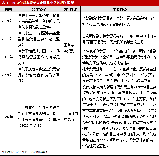近年来,为规范国有企业的贸易业务,国务院国资委出台了一系列政策,但政策效果有限,仍有部分企业存在“空转”、“走单”等形式的贸易。2025年3月28日,上海证券交易所发布《上海证券交易所公司债券发行上市审核规则适用指引第3号—审核重点关注事项(2025年修订)》(以下简称“《指引》”),《指引》新增对发行人贸易业务的披露与核查要求,针对新增贸易业务和贸易业务收入占比超过30%的企业,需从客户及供应商关联性、会计核算方法、商业合理性三个维度进行充分披露。《指引》从发债场景加强了对贸易业务的约束,在市场监管层面落实了国资委的政策精神,强化了贸易业务的风险管控。