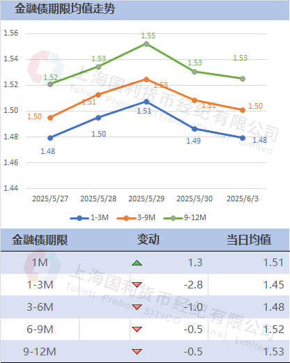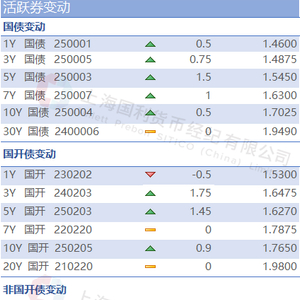 金融债方面:1年国开230202成交在1.52-1.53;1年非国开250411成交在1.525;3年国开240203成交在1.635-1.65;3年非国开250403在1.64-1.6475;5年国开250203成交在1.615-1.629;5年非国开250405成交在1.6825-1.695;7年国开220220成交在1.785-1.79;7年非国开240307无成交;10年国开250205成交1.7525-1.765;10年非国开250410成交在1.805-1.8175。