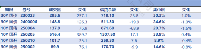 活跃券方面,10年国债250004需求进一步减弱,到期平仓较多,借贷余额下降68亿,供应充足。10年国开250205需求较上周略有增加,期限以短期限为主,供求均衡。250210需求总体稳定,供应充足。30年方面,230023从早盘开始便有大量新增短期限借贷需求涌入,叠加今天大量到期续做的需求,市场供给在9点左右便宣告枯竭,借贷余额增加24亿,集中度重新回到了30.3%。其他30年需求相对较弱,借贷余额小幅下降。