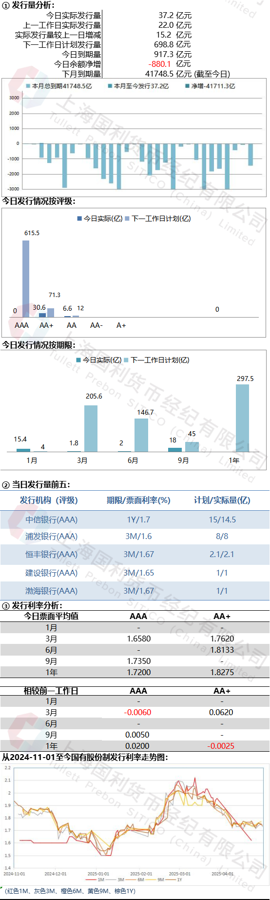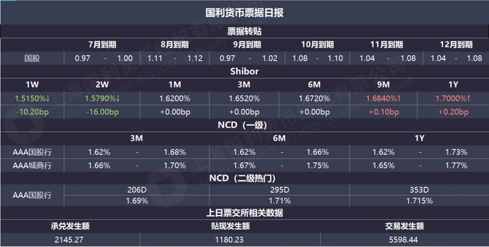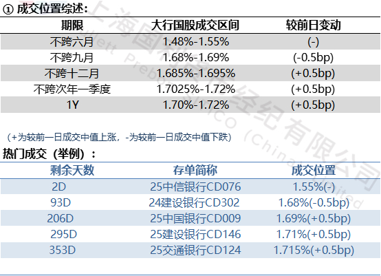 存单二级市场交投相对活跃,月内到期大行国股全天主要成交在1.5%-1.55%;七月到期大行国股主要成交在1.67%-1.69%;八月到期大行国股成交在1.68%-1.69%;九月到期买盘相对较多,但成交较少,大行国股主要在1.68%附近成交,城商成交在1.69%-1.70%;四季度到期大行国股成交在1.685%-1.695%,城商主要在1.70%成交;明年一季度到期大行国股早盘成交在1.70%,随后收益率略有上行,午后主要成交1.71%-1.72%至收盘。明年四五月早盘大行成交1.70%,后逐渐上行,临近中午成交在1.71%,午后继续上行至1.715%-1.72%成交,AAA大城商主要成交在1.73%-1.74%。