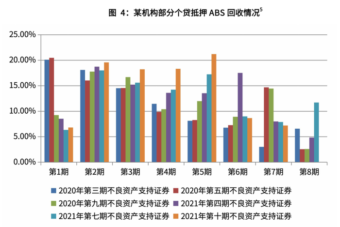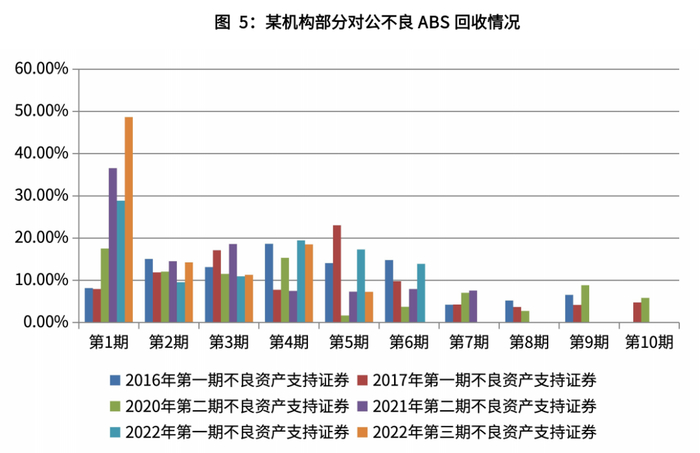 回收时间分布决定投资者现金流的久期匹配与再投资风险,不同产品回收分布和回收周期均呈现差异。在回收分布上,个人信用不良ABS随着期限的增加,回收难度增加,回收分布呈现明显的下行趋势。对于个贷抵押不良ABS回收,因抵押物的司法处置需要一定的时间,对回收下降起到缓冲作用,整体的回收周期更长,往往呈现“缓释性衰减”特征。这一情况可通过下图某机构同期发行的个人信用不良ABS和个贷抵押不良ABS的回收情况清晰反映。对公不良ABS的回收分布最为分散且不确定,我们可通过图6,发行对公不良ABS较多的某机构部分项目回收情况来看,不同项目回收差异较大。此外,因回收分布不同,抵押类项目回收周期长于信用类项目,证券的发行周期亦长于信用类项目。