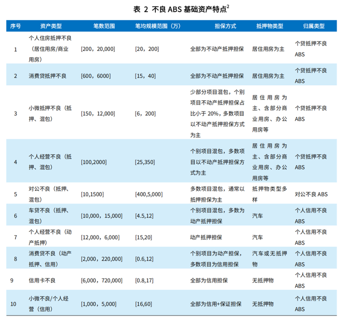 不同基础资产类型的产品在贷款数量、单笔规模、担保方式、抵押物类型方面均存在差异,而担保方式和借款人主体性质是基础资产最特异性的特征。具体来看,从下表可以发现,以不动产抵押为主要担保方式的产品(如表2序号1-5),贷款笔数相对较少、分散度较低,单笔规模相对较大,且抵押物类型多以居住用房为主;而担保方式为信用类、保证类或动产抵押类的不良产品(如表2序号6-10),笔均规模相对更小、分散度更高,一般无抵押物,或个别项目涉及以汽车为动产抵押。因此担保方式是决定基础资产特征的重要因素,将其按照担保方式分为信用类和抵押类。