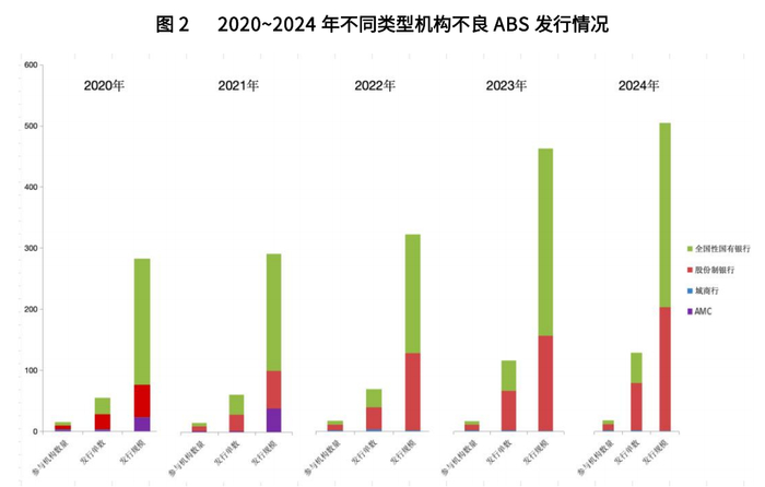 从近年来的发行情况看,2020年后参与不良ABS发行的机构共22家,机构类型包括国有银行、股份制银行及资产管理公司。国有六大行为市场发行主力,以2024年发行情况为例,其发行规模304.18亿元,占比59.80%。此外,股份制银行参与度持续提升,2024年发行单数占发行市场60%,其在不良类ABS发行市场日益活跃。整体看,近年来参与机构自2019年扩容以来,依然保持多元化。而不同发起机构依托差异化的资源禀赋与业务定位,发行的不良ABS产品谱系不同,进一步导致不良ABS市场产品丰富化。