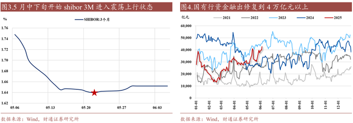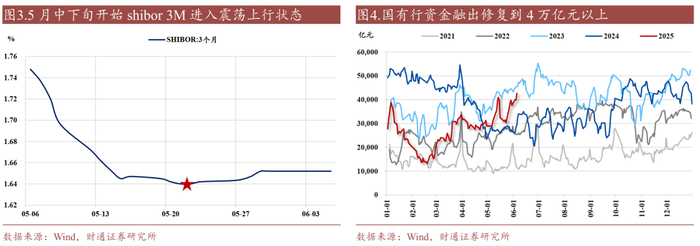 例如5月中旬降准落地,但或由于买断回购/MLF到期以及政府债缴款等诸多因素,大行的中长期负债端有一定不确定性,从指标来看,则是月中大行融出快速下行、月末震荡回升,以及3M Shibor延续震荡上行,流动性在缴税以及月末等特殊时间点,仍旧有一定波动。