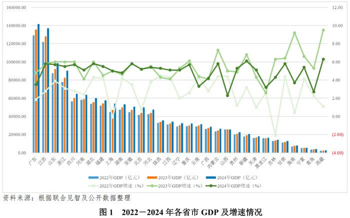 2024年,我国国民经济继续回升向好,初步核算,我国GDP按不变价格计算同比增长5.0%,经济运行稳中有进,同时也面临外部压力加大、内部困难增多等挑战。2024年,各省市区域经济发展水平差距依旧较大,广东、江苏GDP超过十三万亿元,经济总量排名靠前。受外部压力加大、国内需求不足、房地产市场景气度低等多因素影响,2024年大部分省市GDP增速放缓,其中GDP增速较快的区域为西藏和新疆,GDP增速均在6%以上,但区域经济总量较小。十二个重点省市中1中除云南、广西、黑龙江、吉林和青海以外,GDP增速均超过5%。