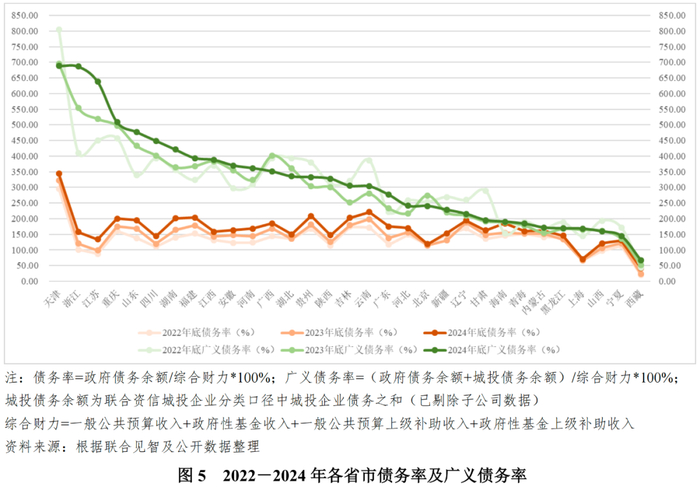 2024年底,江苏、浙江、山东等经济强省广义债务率增速明显高于政府债务率增速。从债务率角度来看,2024年底,重点省市债务率均有所上升,其中贵州、重庆、吉林、云南和天津债务率上升幅度较大,均较2023年底上升超过20个百分点。广义债务率角度,重点省市中除天津和广西2024年底广义债务率较2023年底有所下降外,其余省市广义债务率均保持上升态势。综合来看,尽管2024年债务化解工作已取得一定成效,但重点省市中天津、重庆和广西等的债务水平仍较高,考虑到地方财政仍持续承压,债务化解进度仍需持续关注。
