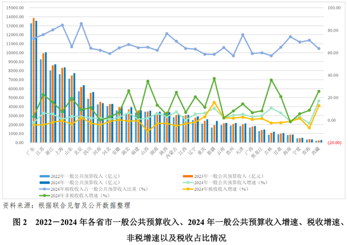 一般公共预算收入方面,2024年,除海南、广东和青海外,全国大部分省市一般公共预算收入保持增长,但主要系非税收入增长所致;其中西藏、吉林和新疆增速均高于10.00%。2024年,浙江、北京和上海一般公共预算收入中税收占比均保持在80%以上,收入质量高;重点省市中内蒙古、天津和青海一般公共预算收入中税收占比均保持在70%以上,一般公共预算收入质量相对较好。受国内需求不足、部分企业生产经营困难、房地产市场持续调整等因素影响,2024年大部分省市税收收入均同比下降。