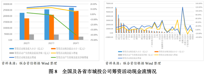 筹资方面:2024年,城投公司筹资活动整体仍呈净流入,但净流入规模降幅较大,区域之间分化明显。净流入规模较大的省市集中于经济及财力水平、再融资环境较好的浙江、江苏等区域;云南、内蒙古、黑龙江和青海4个重点省市城投公司筹资活动现金连续三年净流出;山西、江西、陕西和宁夏城投公司由2023年的净流入转为2024年的净流出。