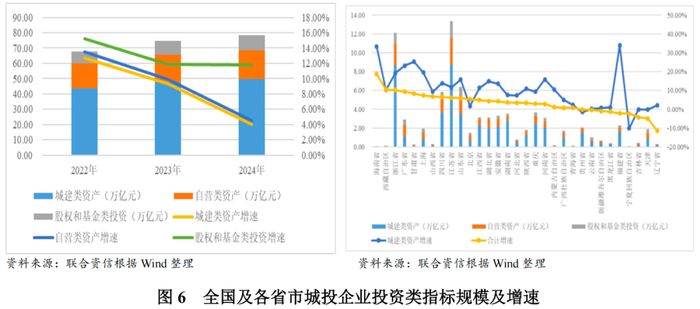 全国整体情况方面:从投资规模来看,2022-2024年底,城投公司城建类资产、自营类资产、股权和基金类投资规模均逐年上升;城镇化水平不断提升的背景下,以发行地方政府债券的形式满足政府投资需求,替代城投公司融资职能,通过债务显性化遏制隐性风险,从而迫使城投公司加速市场化转型,加之弱资质企业因融资渠道受限及化债背景下的控增化存策略等综合影响,2024年上述资产(城建类资产、自营类资产、股权和基金类投资)规模增速分别由2022年的12.66%、13.55%和15.26%下降至2024年的3.99%、4.47%和11.81%。从主要资金投向来看,以土地资产及基础设施建设类项目投入形成的城建类资产和在建工程为主的自营类资产增速明显下降,但受整体基数较大影响,仍是资金主要流向,相比较而言,股权投资增速相对较高,但受基数相对较小影响,2024年新增投资规模仍小于传统城建类资产投资规模。从资产结构看,2024年底,城建类资产、自营类资产、股权和基金类资产在三者合计中占比分别为63.55%、23.95%和12.49%,其中城建类资产占比由2023年的64.19%下降至63.55%,但仍为城投企业主要的资产构成。