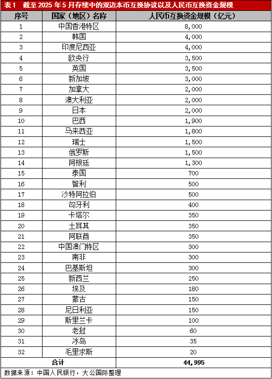 根据公开资料,截至2025年5月末,存续中的双边本币互换协议共计32份,主要涵盖中国香港和澳门特区、韩国、印度尼西亚以及欧元区等国家(地区),总资金规模约为4.5万亿元人民币。