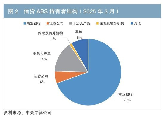 与其他投资机构相比,商业银行自营投资规模大、约束多、风险偏好低,其获取足够体量的个人和中小微企业信贷资产,并实现高效、合理定价的成本较高。信贷ABS通过产品设计满足了银行投资风险管理要求:一是通过双评级、小额分散、内部增信、交易条款设计等方式缓释信用风险,二是破产隔离、依赖资产信用而非主体信用的设计使得其能够突破银行对融资主体授信准入和授信规模的限制,三是过手摊还3、部分产品浮动利率等条款能够在一定程度上缩短组合投资久期、降低利率风险,四是发起机构自持制度防范了委托代理问题和道德风险。资本计量方面,2012年原银监会发布的《商业银行资本管理办法(试行)》规定,标准法下外部评级AA-及以上的ABS适用20%信用风险权重。2024年实施的《商业银行资本管理办法》延续了ABS优先级适用较低信用风险权重的理念。银行投资信贷ABS需承担的资本成本与投资地方政府债一致,远低于一般对公贷款和信用债。叠加流动性溢价带来的票息保护,商业银行投资信贷ABS规模远超其他机构(见图2),投资模式以配置持有为主。