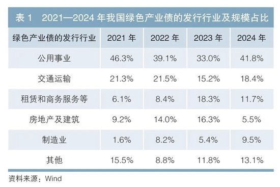 从发行行业看,近年来主要分布在公用事业、交通运输等行业(见表1),但各行业发行规模变动趋势有所不同。一是绿色金融债发行占比波动上升,预计未来仍将保持较大规模。根据Wind数据,绿色金融债发行占比已由2021年的18.7%最高升至2023年的47.4%(见表2),且以商业银行债券为主。二是传统优质行业绿色产业债1的发行规模占比有所下降。在绿色产业债中,公用事业和交通运输行业为传统绿色产业债发行的两大行业2,二者合计发行规模占比约为50%。由于上述行业的发债主体信用资质整体较优,2022—2023年,在低利率贷款替代增多以及绿色债券发行监管趋严的情况下,这些企业发行绿色债券的意愿有所下降,其发行规模占比随之下降。自2024年以来,随着商业银行贷款利率管理从严,优质客户的发债融资需求增加,公用事业和交通运输行业合计发行规模占比有所回升。三是租赁等行业绿色产业债发行规模占比上升。在绿色产业债中,租赁和商务服务、房地产及建筑、制造业企业绿色债券发行规模波动上升,尤其租赁和商务服务行业目前已成为第三大绿色产业债发行行业,主要是由于上述行业发行人的综合融资成本相对较高,而近年来债券市场利率持续下行,故通过绿色债券融资对此类企业更具吸引力。