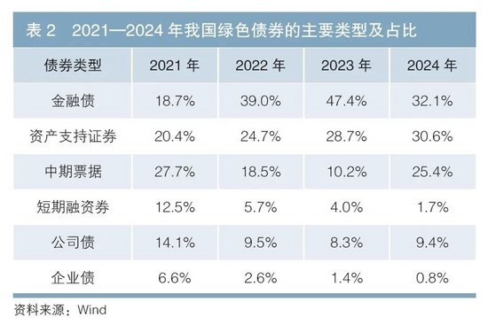 从期限分布看,与其他债券品种相比,中期票据、公司债的发行期限相对灵活,发行规模较大。2024年,绿色中期票据、绿色公司债的平均发行期限均较此前显著延长(见表3)。2024年,10年期及以上绿色中期票据与绿色公司债共计发行26只,明显大于以往年份的发行数量(2021—2023年年均发行2~5只),主要是由于2024年债券市场利率整体降至历史低位,发行长期限债券有助于发行人获得更长期的低利率融资。